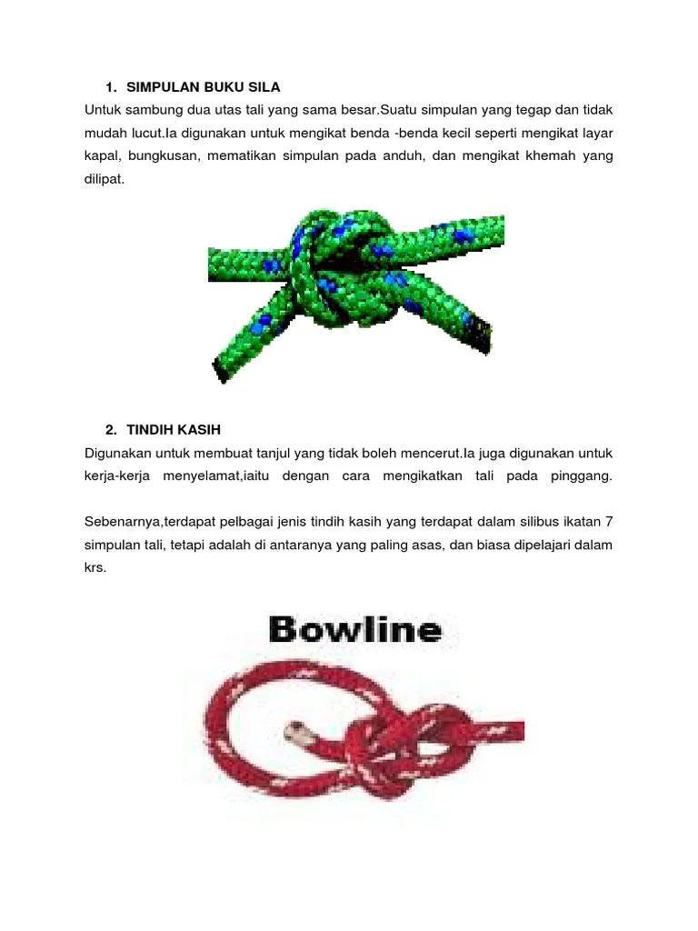 Jenis jenis ikatan dan fungsinya untuk tosa tosa blog. Digunakan untuk membuat gegelung tali yang tidak terjerut atau mengikat leher binatang supaya tidak terjerut. Cara bagaimana menyambungkan 2 tali yang sama saizcara mudah simpulan buku sila. Antara gambar berikut, yang manakah merujuk kepada ikatan simpul tindih kasih? Buku sila (reef knot) simpul bunga geti (sheet bend) simpul manuk (clove hitch) simpul tindih kasih (bowline) lilit dua simpul (round turn two half hitches) .